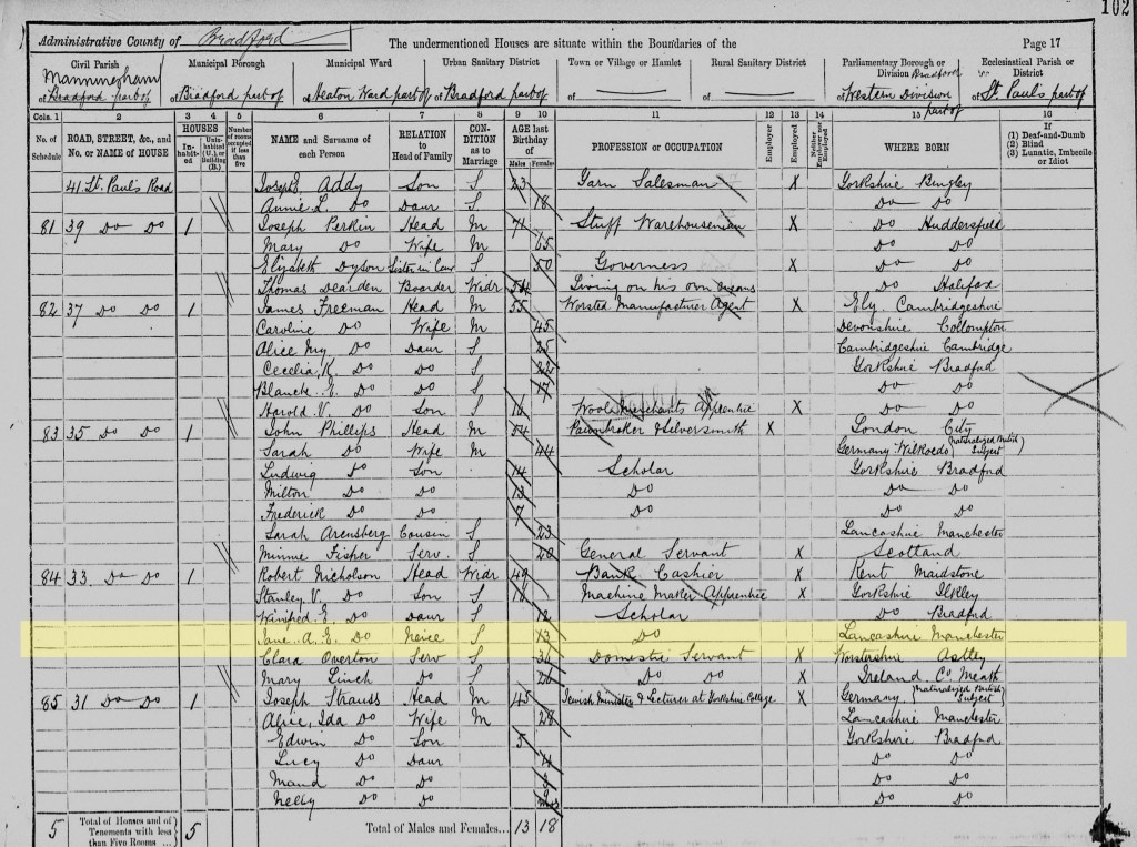 However, Edith was not present for the census. Now 13 she had obviously been sent away for her education and is shown living with her uncle Robert at 33 St Paul’s Road, Manningham, Bradford where ‘Jane A.E. Nicholson’ is listed as a ‘scholar’ alongside her cousin Winifred. At the time Manningham was an immensely important industrial suburb of Bradford and home to a large German community, as is shown by the fact that Edith’s next-door neighbour was Joseph Strauss, a German Jewish minister and lecturer at a local college. Many of the streets in Manningham are named after German cities – indeed, three years later in 1894 the novelist J.B. Priestley was born in nearby Mannheim Road. One other German immigrant to Bradford around this time was Julius Delius whose son Fritz achieved fame as a composer after changing his name to Frederick Delius, writing many works that have been performed by the Hallé Choir over the years.