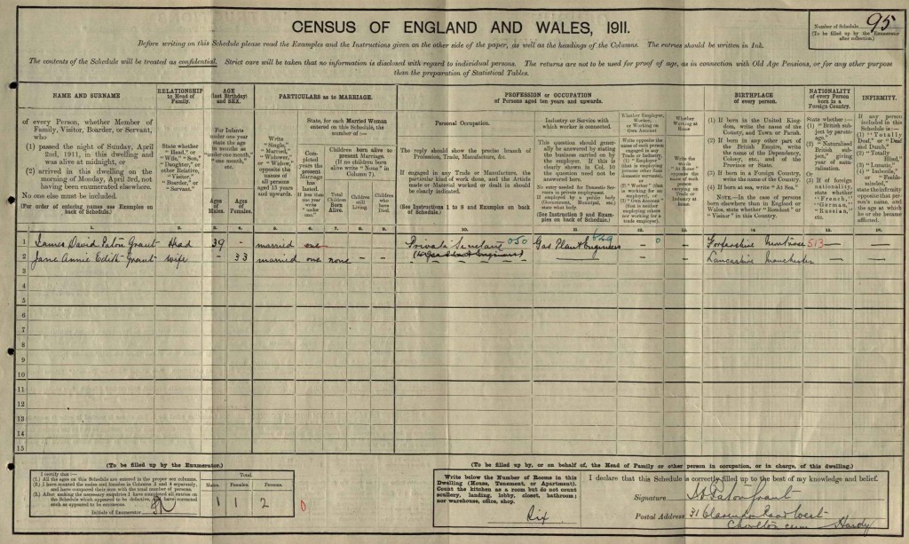What happened to Edith in the years that followed? Her life with Alfred didn’t last much longer as in the census of 1911 Alfred is still living at 2 Blair Road, not with Edith but with his new wife, having married 42-year-old Sarah Gertrude Jamison the year before. One imagines that Edith, now in her late 20s, may have seen the kindling of a relationship between Alfred and Sarah as an opportunity to seek out love for herself, as the prospect of a lifetime looking after her father began to recede. She therefore actually beat her father to marriage, marrying James David Paton Grant in 1909. James was a Gas Plant Engineer from Montrose 6 years her senior and by 1911 they were living at 31 Clarendon Road West, Chorlton-cum-Hardy.