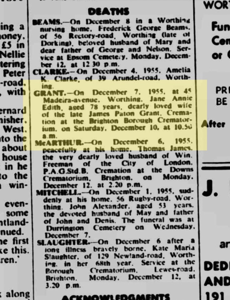 Yet another move came before the outbreak of war in 1939 by which time the couple are shown as living in Thoresby Road, Wilmslow, presumably in happy retirement as James was by now 67. They lived here throughout the war but sadly James died soon after in 1946. As an only child and with no other dependents, Edith was obviously quite comfortably off so took the decision to move to the south coast where she purchased a modestly grand detached house on Madeira Avenue in Worthing, Sussex. It was here that she died on December 7th, 1955, aged 78. Jane Annie Edith Grant’s death notice in the Worthing Herald describes her just as the ‘dearly loved wife of the late James Paton Grant’, with no mention of her time singing with the Hallé Choir nearly 50 years before.