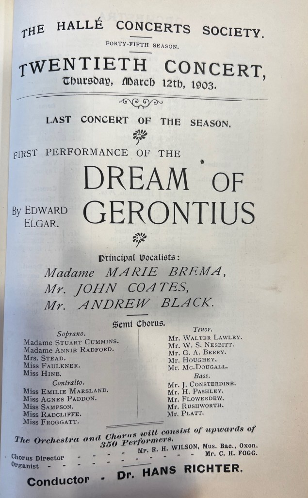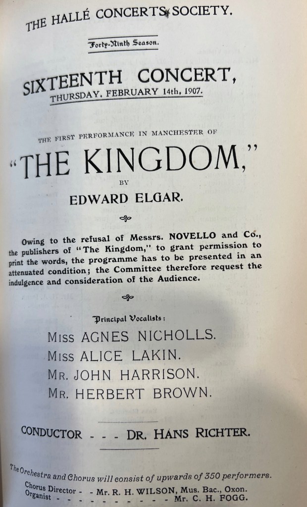 A lucky chance has provided me with the opportunity to highlight just one of these ordinary individuals, whilst at the same time, in preparation for the Hallé’s celebration of the oratorios of Edward Elgar in June 2023, providing some background as to how the works of Elgar entered the choir’s bloodstream in the first decade of the 20th century. That chance was provided me by one of my fellow basses in the Hallé Choir, Vin Allerton, who had come into possession of two early Elgar vocal scores. One was for The Apostles, with indications within that it was purchased for performances of the work by the Hallé Choir in the 1920s. The other was far more interesting – a first edition of the vocal score for The Kingdom that was evidently purchased for the very first Manchester performance of the oratorio by the Hallé in early 1907.