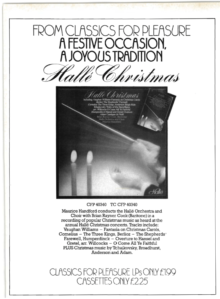 The recording received fulsome praise from the reviewers. Reviewing the LP in the Gramophone in November 1980, William Chislett called it ‘excellent in all respects and an outstanding bargain.’ Compact cassettes had by this time been an important extra medium for recordings for a decade, though quality issues made them possibly less suitable for classical recordings than traditional LPs. For something like a Christmas album, however, the cassette was ideal, as can be seen from the advertisement for the reissue of the album the following year. The cassette version was actually included in Ivan March’s ‘Cassette Commentary’ column in the December 1980 issue of the Gramophone, where he summed it up as follows: ‘Finally, let me recommend for Christmas the Hallé Choir and Orchestra’s “Hallé Christmas” – a well-planned concert, not just a collection of carols – conducted by Maurice Handford.’