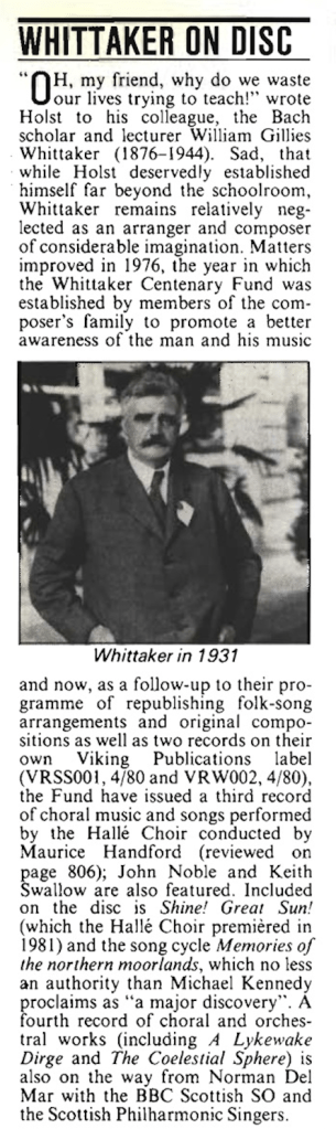 Michael Oliver, reviewing the LP in the December 1983 issue of the Gramophone is aware of the difficulty and sometimes sheer oddness of some of the music, but praises the choir: ‘the Hallé Choir surmount the vast difficulties of this music (Whittaker the great choral trainer is exploring the limits of what concerted voices can do ) with only an occasional hint of strain.’ He concludes that ‘the recording is excellent.’ Calum MacDonald reviewed the album for Tempo magazine. Again he observes problems with Whittaker’s music in that ‘in some of the larger scores the undoubtedly fertile invention seems to lack structural focus’, but accepts that ‘there is clear evidence of an original mind, capable at its best of producing intense musical experiences not quite like any other composer.’ For the music itself he is particularly praising of the choir’s performance of Requiem Aeternam, where he feels that ‘its intense, glowing cluster harmonies, handled with great skill and harmonic logic, are almost a weird foreshadowing of Ligeti.’ Not quite what one might have expected from a man who had arranged Bobby Shaftoe!