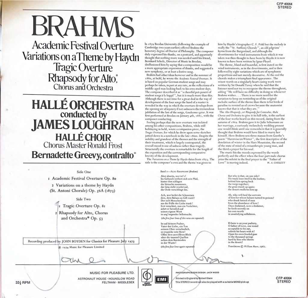 Back cover of Brahms’ Alto Rhapsody – CFP 40064. Note James Loughran’s signature