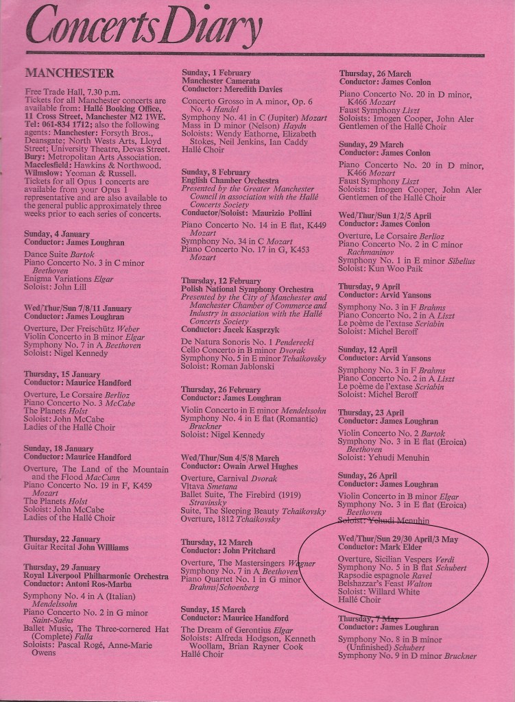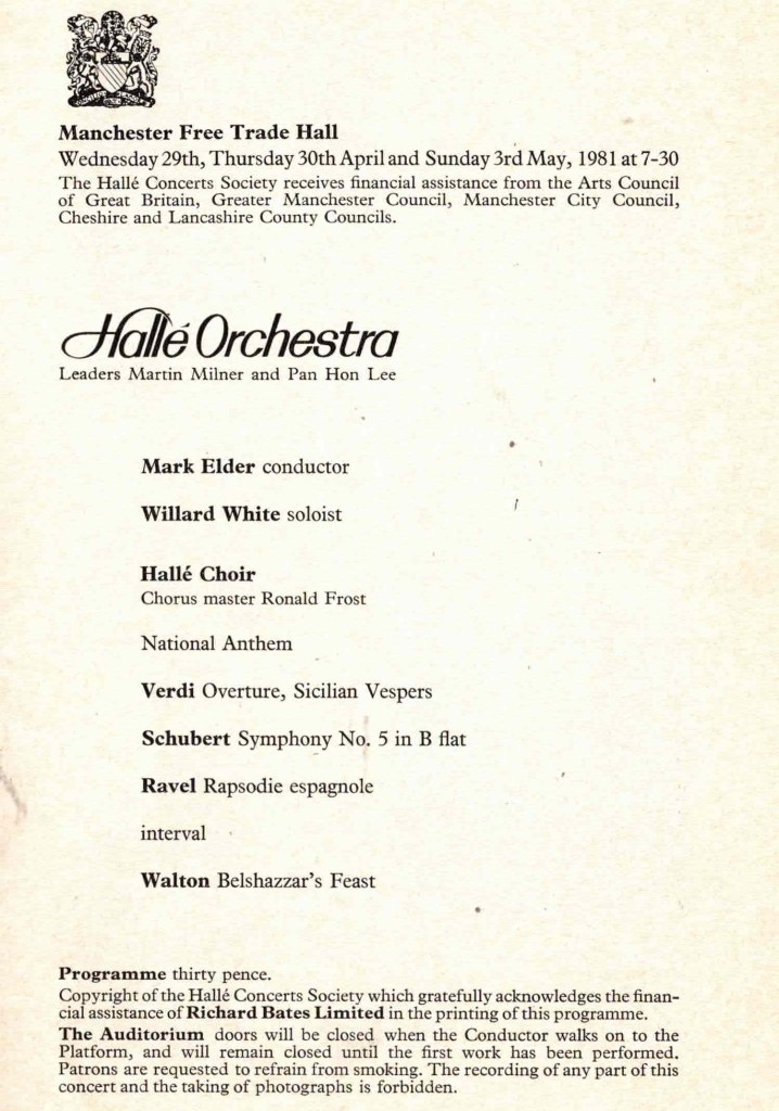 The programme shows that the soloist for the three concerts was the great Jamaican baritone Willard White who went on to perform the piece a further two times with the choir during the 1980s. He had worked with Elder at English National Opera in the 1970s and began a trend Elder continued when he took over as Music Director of the Hallé in 2000 of working with singers that had achieved success with ENO , singers such as Lesley Garratt, Brindley Sherratt and David Kempster. Sadly, and probably due to the ubiquity of Belshazzar’s Feast in the choir’s repertoire at the time, neither the Guardian nor the Manchester Evening News saw fit to review any of the three performances.