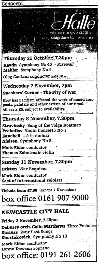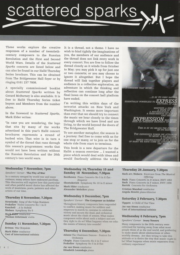 The theme chosen for the 2001/02 season was ‘Scattered Sparks’. To quote from the description in the Autumn 2001 issue of Hallé, as the Hallé newsletter had been renamed, the works chosen for ‘Scattered Sparks’ ‘explore the creative responses of twentieth-century composers to the Russian Revolution and the First and Second World Wars.’ In a tragic echo of those conflicts, the themed concerts began on November 7th 2001 less than two months after the tragic events of September 11th, when Saudi-based terrorists brought down the World Trade Centre in New York and triggered conflicts that we are still experiencing the consequences of today, a coincidence not lost on Mark Elder when he wrote about the season in the Guardian on October 5th: