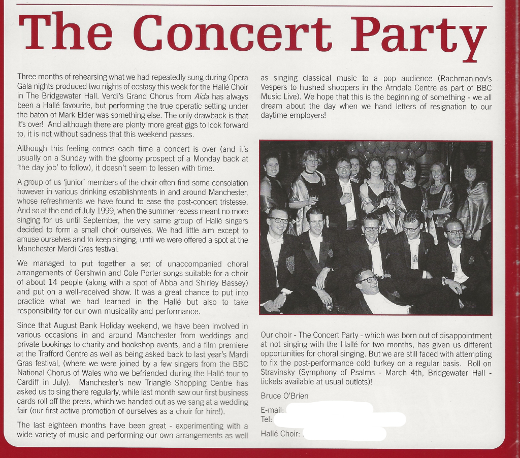It is noticeable that in these early Elder era set-piece concerts the choir were often joined by a second choir for added volume. Though this still happens occasionally for the really big projects such as the Proms, the choir soon became better able to fight for itself on the bigger stages, for reasons that will be explained soon. The choir were obviously enjoying themselves, however, as the article below from the Winter 2001 edition of Hallmark about extra-curricular activities during rehearsals for the Verdi concert demonstrates!