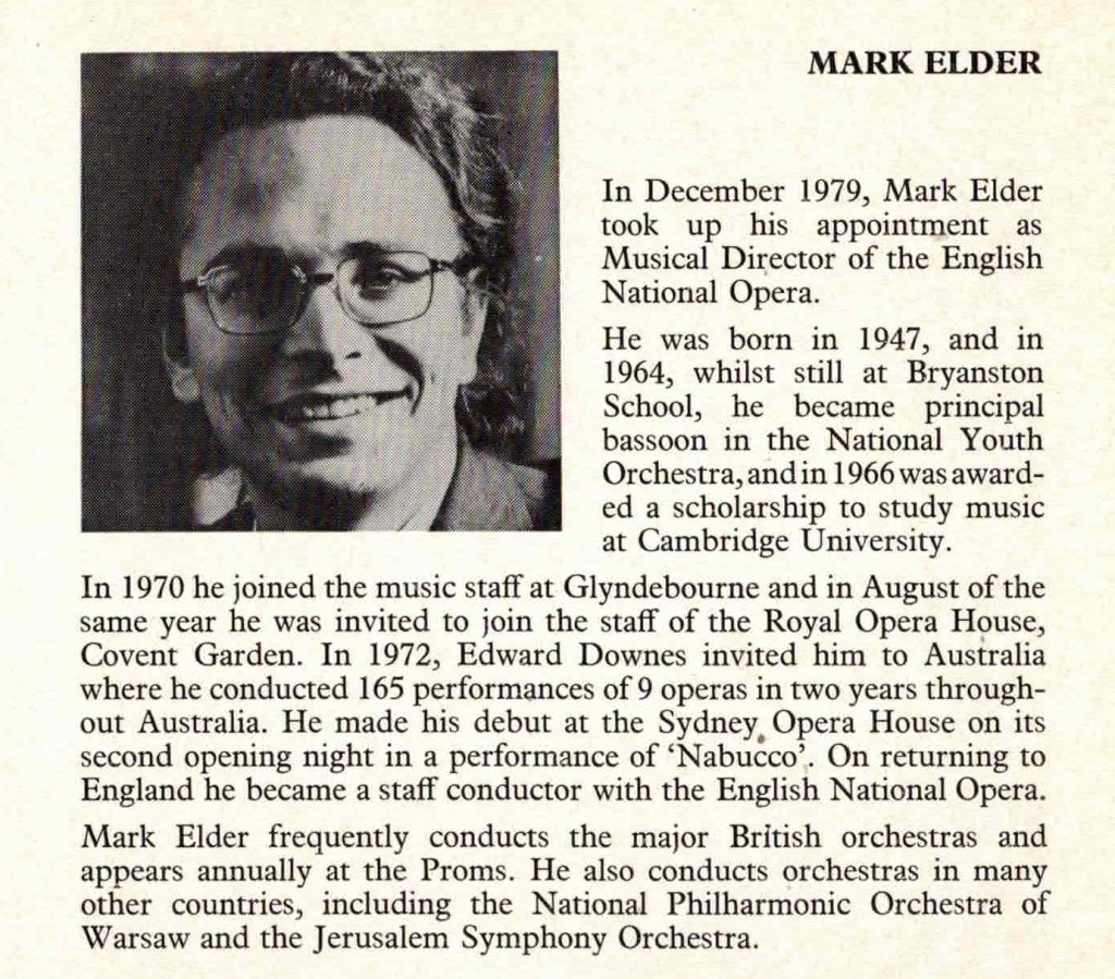 Returning from Australia in 1974 he began conducting at English National Opera, where Charles Mackerras was at that time the Artistic Director. He took over from Mackerras in 1979, staying in post up until 1993. For the first 20 years of his conductor career, therefore, opera took up by far the biggest proportion of his conducting time and he oversaw what were extremely successful years for ENO, especially when compared with the perilous state of the company in 2024. He also conducted opera at Glyndebourne, Covent Garden, Chicago Lyric Opera, the Metropolitan Opera in New York, at the Bayreuth Festival and elsewhere