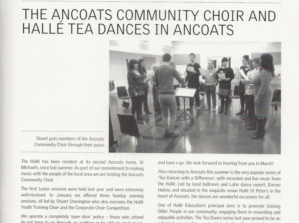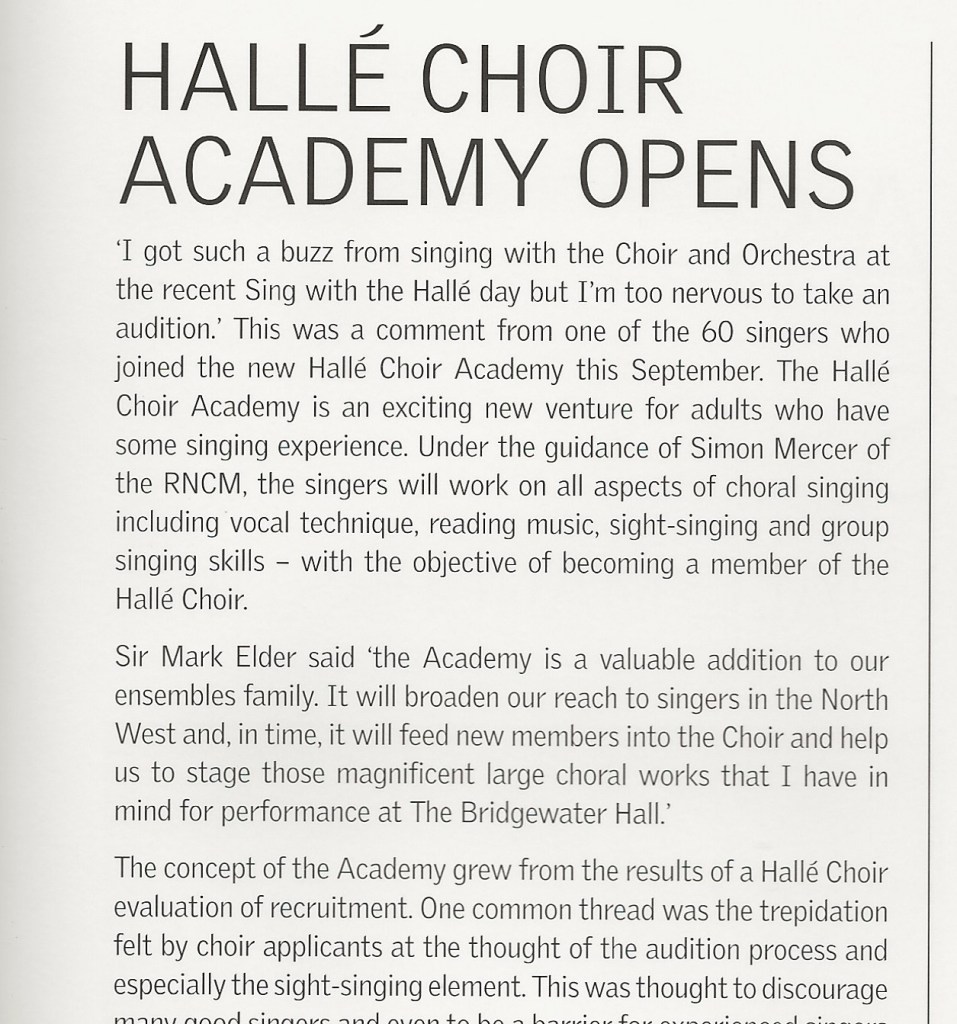 The community choir was formed in early 2014 and later that year saw the foundation of the Hallé Choral Academy. This was designed to fulfil a similar role to the Hallé Youth Training Choir, taking good singers who felt themselves lacking in vocal technique and sight-reading skills and training them up to a standard where there was a potential for them to be auditioned for the main Hallé Choir. The Academy was announced in the November 2014 issue of Hallé, with an encouraging endorsement from Mark Elder, and again it has borne fruit, with many singers over the last 10 years making the step up from the Academy to the main choir.