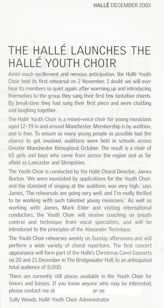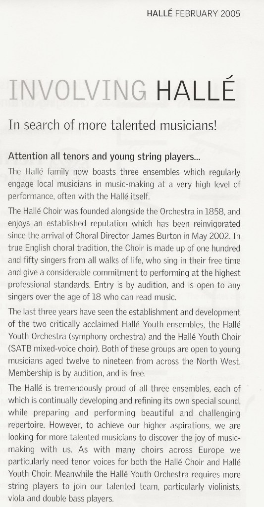 The February 2005 issue of Hallé saw an advertisement for tenors for the Hallé Youth Choir and also for strings for the Hallé Youth Orchestra (with a side order for tenors for the Hallé Choir!). The Youth Orchestra was another innovation started by Mark Elder, providing opportunities for young instrumentalists in the North West to play to the highest standard possible, trained by the Hallé’s Assistant Conductor, yet another post initiated by Elder to provide a training ground for young conductors, most of whom have gone on to achieve great success. For example, the first Assistant Conductor was Edward Gardner who went on to the emulate Elder by taking control at English National Opera and who now directs both the London Philharmonic and Bergen Philharmonic orchestras.