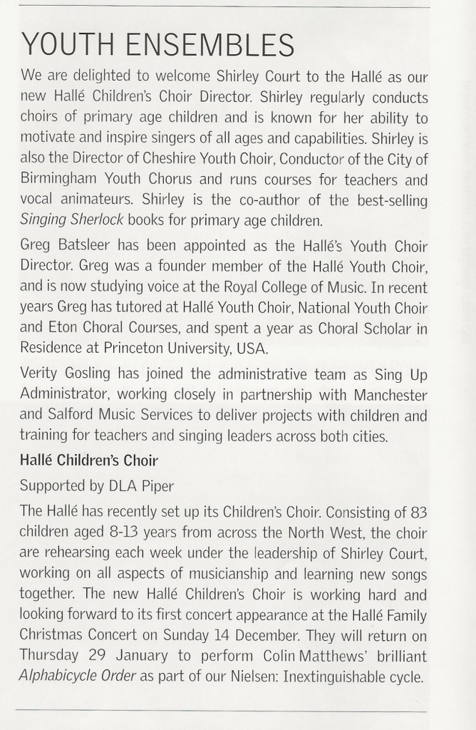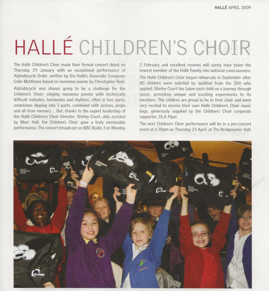 2008 saw the foundation of the Hallé Children’s Choir with as its first, and thus far only, director the redoubtable Shirley Court, and this was celebrated in the February 2008 issue of Hallé. The choir was set up for children between the ages of 8 and 13 and it immediately became a permanent fixture in the Hallé’s annual Christmas carol concerts alongside the Hallé Choir and the Hallé Youth Choir.