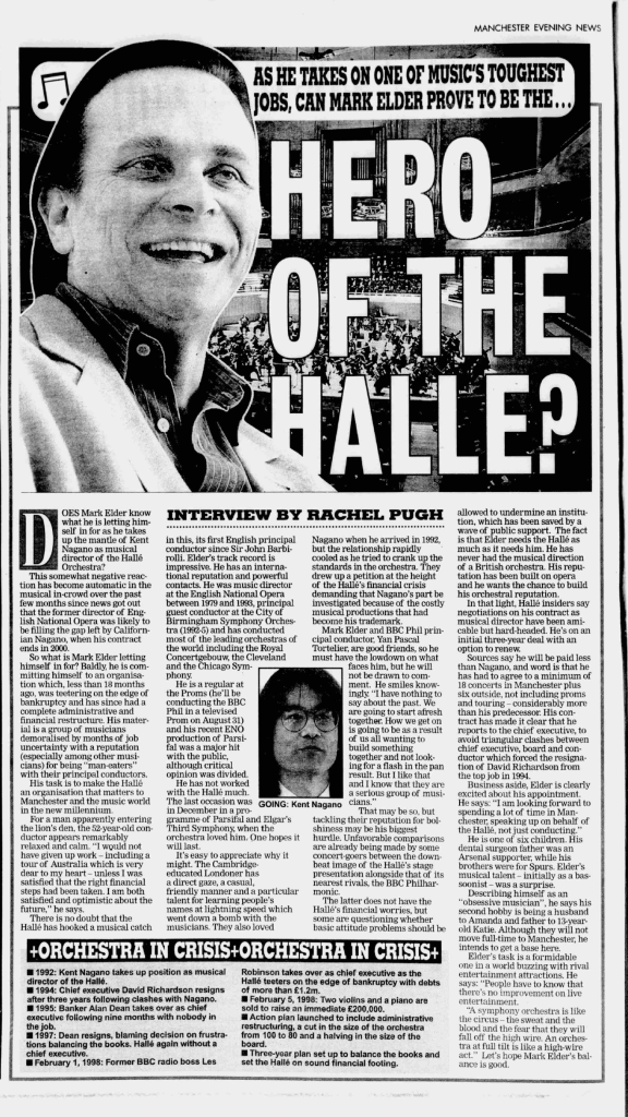 As mentioned in an earlier blog, 1999 was a critical time for the Hallé Orchestra. Kent Nagano’s time with the Hallé had seen artistic successes but these had come at a huge cost as Nagano’s ambitions for the orchestra moved beyond the Hallé Concerts Society’s ability to pay for them. Rachel Pugh’s interview with Mark Elder, published in the Manchester Evening News four days after his appointment to succeed Nagano was announced, itemised some of the issues facing the orchestra, the most recent of which were listed as: