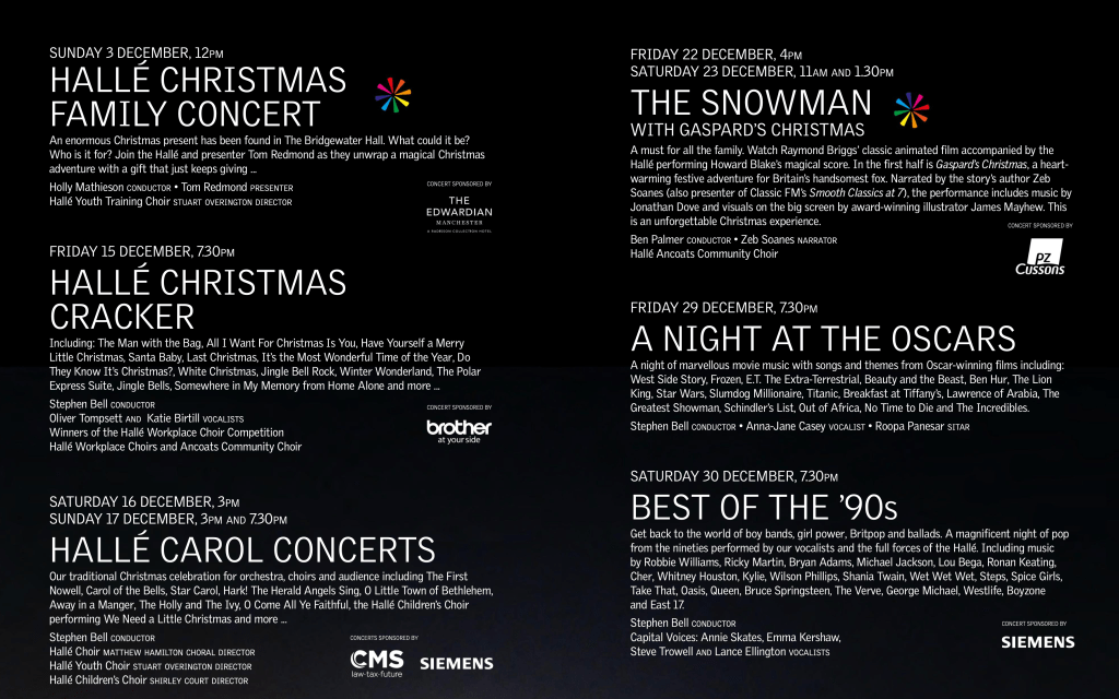 When Sir Mark Elder began his time as Chief Conductor and Music Director of the Hallé in 2000 there was just one choir within the Hallé family, the Hallé Choir itself which had been standing alone since its foundation back in 1858. By the time he leaves in August of this year there will be six choirs operating directly under the Hallé banner plus the numerous choirs that compete in the Workplace Choirs Competition. The success of this astounding expansion is evidenced by the Christmas concert pages from the Hallé’s 2023/24 season brochure shown below. You can see that at various times during the pre-Christmas period the Hallé Choir, Hallé Youth Choir, Hallé Youth Training Choir, Hallé Children’s Choir, Ancoats Community Choir and the winners of the Workplace Choir competition all got the opportunity to appear in concert in the Bridgewater Hall with the Hallé Orchestra. The only choir to miss out were the Choral Academy and their turn will come with the annual Sing With The Hallé day in June 2024, in which they will play a vital part.