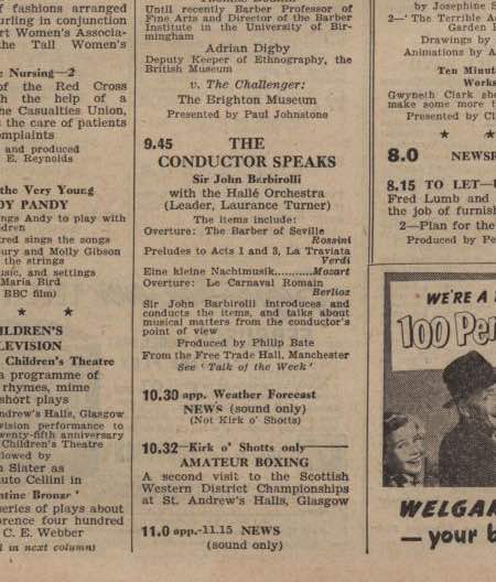 1952 was an important year for the Hallé Orchestra. It saw the release of its first LP record, a recording of Tchaikovsky’s Swan Lake music and also its first proper appearance on television. Two years earlier, in 1950, the orchestra were in a programme about the documentary film A City Speaks, playing Wagner’s Ride of the Valkyries on the soundtrack of the film, and later that same year Arthur Percival, sub-leader of the orchestra appeared in a short programme in which he gave, to quote the Radio Times, ‘some light-hearted impressions of famous conductors under whom he has played.’ However, the programme on November 20th, 1952, relayed from the Free Trade Hall, was the first time the orchestra had appeared performing in person. The programme, part of a series entitled The Conductor Speaks, showed the orchestra playing music by Rossini, Verdi, Mozart and Berlioz, with the pieces introduced by their chief conductor Sir John Barbirolli. Michael Kennedy makes the point that such performances on television by Barbirolli and others were important in bring classical music to a wider audience: