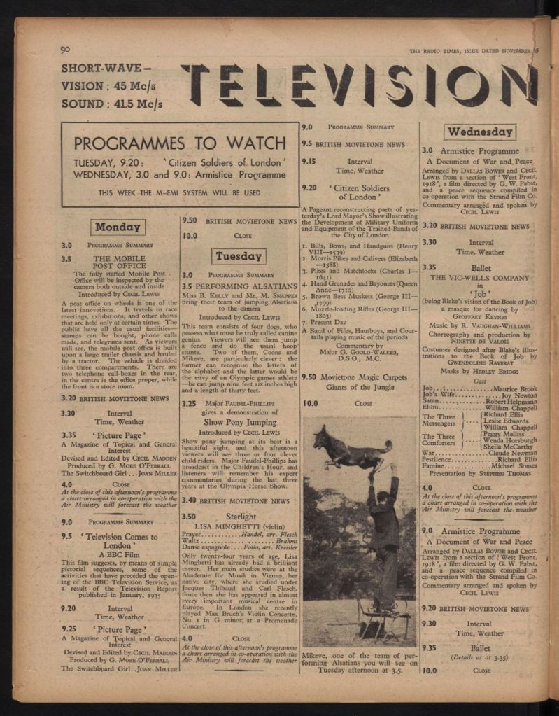Below you can see this recital listed within the first ‘Television’ edition of the Radio Times. You can sense the ‘inform, educate and entertain’ mantra coming through loud and clear, with the recital accompanied by programmes on the Post Office, performing dogs, Show Jumping, the Lord Mayor’s Show and commemorations of the Armistice. Continuing the early dance theme, there were also two performances of Ninette de Valois’ Job, set to music by Ralph Vaughan Williams and performed by members of the Vic-Wells Ballet, the direct descendant of which is the modern day Royal Ballet.