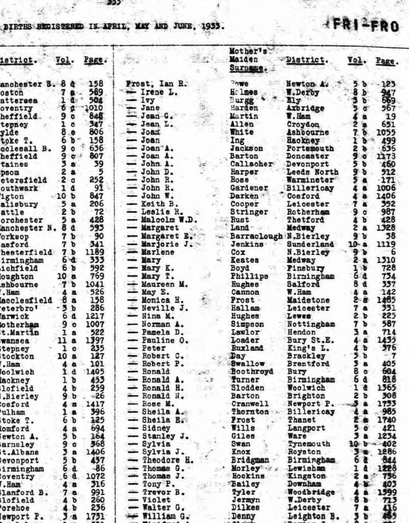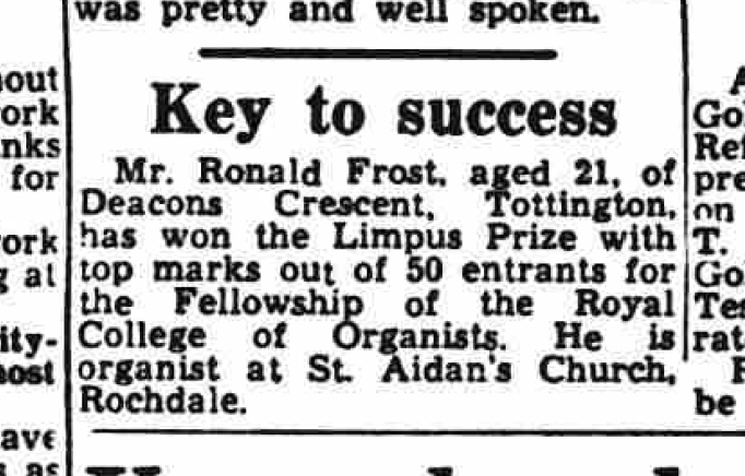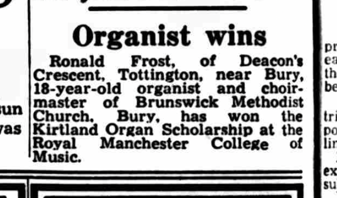 Ronald Frost was born in Bury on 30th March, 1933 to 34 year old Allan Frost, a Mechanical Engineer Draughtsman and 32 year old Alice (née Boothroyd). They already had two daughters, namely Muriel, born in 1925 and Margaret, born two years before Ronnie in 1931. Importantly, Allan was also organist and choirmaster at a local Methodist church.