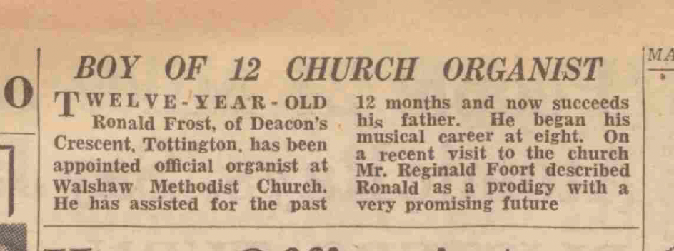 The first report in the Manchester Evening News, from 24th August 1945, shows that at the age of only 12 Ronnie had developed skills as an organist sufficient to be given an official position as organist at Walshaw Methodist Church. His talent was such that celebrity cinema organist Reginald Foort felt moved to describe him as ‘a prodigy with a very promising future.’