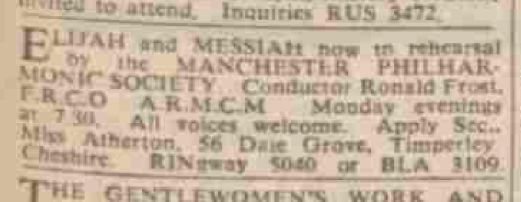 By 1958 we see Ronnie being associated as conductor with two local amateur choirs. The Maia Choirs had been founded in Stockport in 1902 by the chemist Thomas Kay, a later JP and Mayor of that town. He was keen to establish a series of choirs of all ages to foster the development of singing within the town. Harold Dawber became their Director of Music in 1929 and the choir appeared frequently with the BBC Northern Orchestra. When Dawber died Geoffrey Barber took over and was joined by Ronnie whose job was specifically to look after the Maia Boys’ Choir, a job he undertook for the next five years. In addition, via an advertisement in the Manchester Evening News in 1958 we see that Ronnie was now also conductor of the Manchester Philharmonic Society who were inviting new members for future performances of Elijah and Messiah.