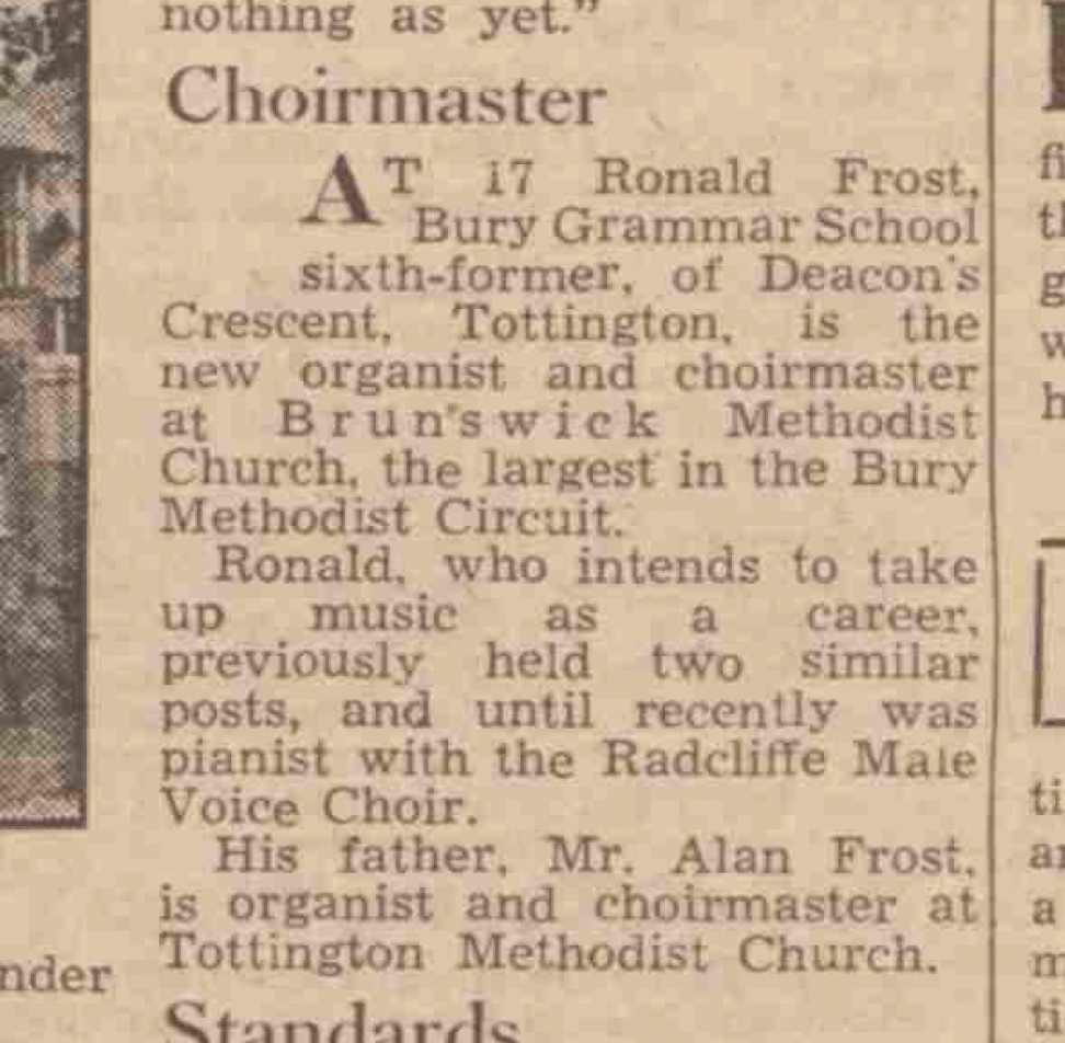 Truer words had never been spoken, especially when we read in the same newspaper five years later that Ronnie, aged 17 and still in the sixth form at Bury Grammar School, had advanced to become both organist and choirmaster at Brunwick Methodist Church, ‘the largest in the Bury Methodist Circuit’. It also reports that this was the third such appointment he had held, and in addition that he had served as the accompanist for the Radcliffe Male Voice Choir. The foundations for his future career had been well and truly set.