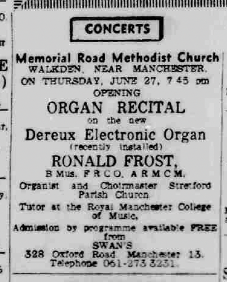 Note that Ronnie had by now moved to a new church position in Stretford. This was not to be his final church appointment, as we will see in the next blog post. His connections with the Methodist Church had not ceased, however, as we see from an advertisement in June 1968 for a recital by ‘Ronald Frost, B Mus, FRCO, ARMCM, Organist and Choirmaster Stretford Parish Church, Tutor at the Royal Manchester College of Music’ on ‘the new Dereux Electronic Organ (recently installed)’ at the Memorial Road Methodist Church in Walkden.