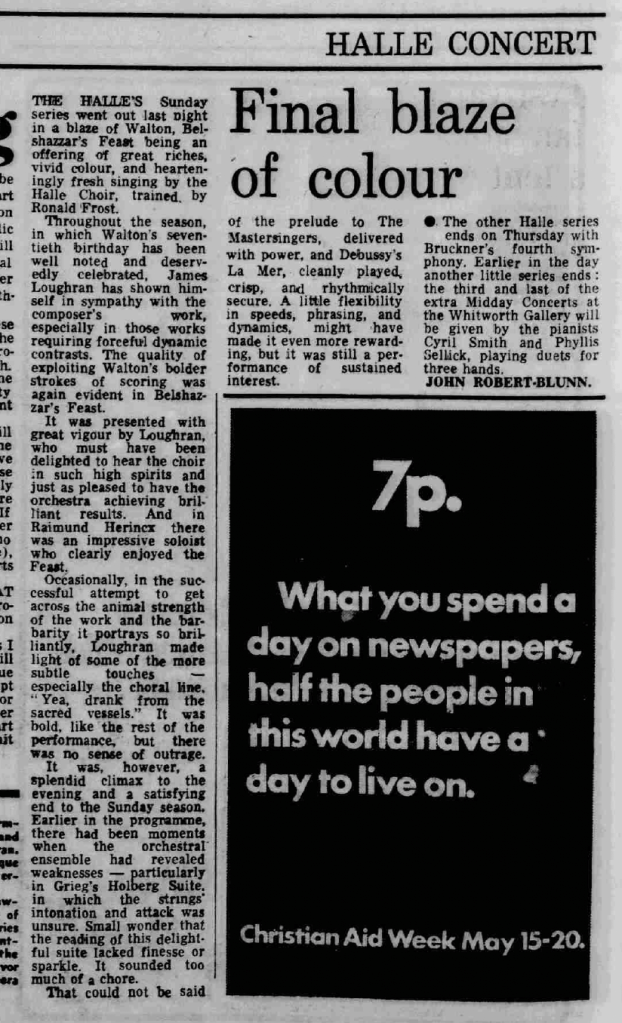 As it happened, fate intervened. A Manchester Evening News review by John Robert-Blunn of a Hallé performance of Walton’s Belshazzar’s Feast in May 1972, conducted by James Loughran, notes that the Hallé Choir were trained by Ronald Frost, and what is more that the performance was ‘an offering of great riches, vivid colour, and hearteningly fresh singing by the Hallé Choir’.